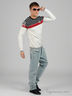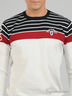 Классический мужской джемпер из приятного на ощупь трикотажа. Круглая горловина. Длинные рукава с манжетами в рубчик. Декорирован красными и темно-синими полосами.