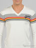 Классический мужской джемпер из теплого, приятного на ощупь трикотажа. V-образная горловина. Длинные рукава. Манжеты и низ изделия выполнены из трикотажа в рубчик. Джемпер декорирован яркими полосами и бархатистой нашивкой.