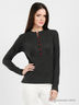 Стильный джемпер из плотного, слабоэластичного полушерстяного джерси в мелкий горошек. Округлый вырез горловины. На полочке от горловины идет глубокий разрез, застегивающийся на контрастные пуговицы. Отрезной лиф с заложенными встречными складками. Длинные рукава. Отлично будет сочетаться с разными по фасону вещами!
