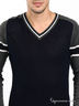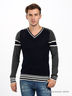 Превосходный джемпер с V-образным вырезом горловины и длинными рукавами. Эта модель декорирована принтом в полоску. Низ изделия и манжеты окантованы в рубчик.