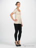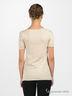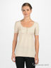 Трикотажный джемпер с короткими рукавами светло-бежевого цвета. Широкая круглая горловина. Манжеты посажены на трикотажную резинку. На полочке планка-застежка на пуговицах.