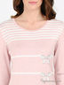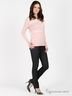 Модный джемпер из эластичного вискозного трикотажа средней плотности с округлым вырезом горловины и длинным рукавом. Спинка украшена декоративной прорезью с бантиками. Полочка украшена рисунками и стразами. Отлично будет сочетаться с разными по фасону и фактуре вещами.