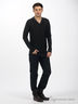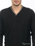 Стильный мужской джемпер с V-образным вырезом горловины. Манжеты рукавов и низ изделия выполнены из более плотного материала. На груди нашивка и металлическая вставка.