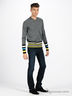 Очень мягкий джемпер найдет достойное место в Вашем гардеробе и станет любимым предметом гардероба. Тонкая, шерстяная ткань. Прямого кроя. V-образный вырез горловины обработан трикотажной резинкой в рубчик. Длинный прямой рукав и низ изделия с высокой резинкой в рубчик. Джемпер декорирован цветными полосками.