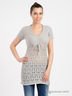 Замечательный джемпер с короткими рукавами. Модель с V-образным вырезом горловины и декорированной завязкой в виде бантика под грудью.