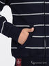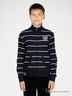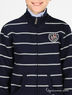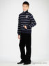 Толстовка прямого кроя с воротом-стойкой застегивается на молнию. Вшитый "рубашечный" воротник создает эффект "двойки". Ворот, манжеты и низ изделия - трикотажные резинки. Два передних кармана. Изделие украшено "полосатыми" аппликациями. На полочке декоративная нашивка. Флисовый подклад.