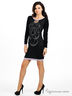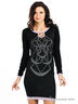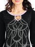 Детали: удлиненная модель, округлый вырез горловины с декоративным вырезом, длинный рукав, рисунок из люрексной нити на полочке