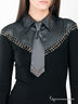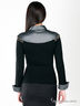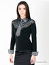 Прилегающий по фигуре силуэт. Отрезной лиф в виде манишки выполнен из ткани с шелковистым отливом. Длинный рукав. Отложной рубашечный воротник с дополнением в виде галстука. На полочке застежка на пуговицы. Линия соединения лифа и полочки декорирована металлическими клепками. Манжеты рукавов с отгибами из ткани в тон отрезного лифа.