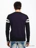 Теплый трикотажный джемпер свободного покроя. Круглая горловина в рубчик. Блинные рукава декорированы белыми полосами.