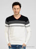 Теплый трикотажный джемпер свободного покроя. V-образная горловина в рубчик. Длинные рукава и полочка декорированы белыми полосами.