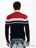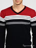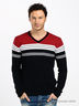 Теплый трикотажный джемпер свободного покроя. V-образная горловина в рубчик. Длинные рукава и полочка декорированы белыми полосами.