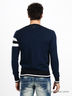 Теплый трикотажный джемпер свободного покроя. V-образная горловина в рубчик. Длинные рукава реглан декорированы белыми полосами.