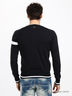 Теплый трикотажный джемпер свободного покроя. V-образная горловина в рубчик. Длинные рукава реглан декорированы белыми полосами.
