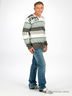 Джемпер тонкой вязки в широкую полоску. Вырез ворота V-образный. Рисунок-принт на плече впереди. Сзади - вышивка.