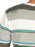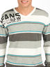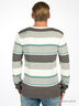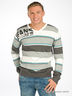Джемпер тонкой вязки в широкую полоску. Вырез ворота V-образный. Рисунок-принт на плече впереди. Сзади - вышивка.