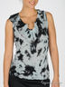 Топ из нежного трикотажа. Прямой крой. Без рукавов. V- образный вырез декорирован рюшей со стразами.