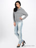 Уютный джемпер из мягкого и приятного на ощупь трикотажа. Широкий воротник хомут. Длинные рукава реглан. Фактура в полоску придает модели изюминку.