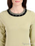 Детали: круглый вырез; рукав 3/4; окантовка выреза и низ изделия дополнены контрастными вставками с пришивными стразами