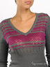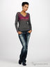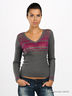 Тонкий трикотажный джемпер приталенного силуэта. V-образный вырез горловины обработан трикотажной резинкой в рубчик. Длинный прямой рукав. Изделие декорировано оригинальной вязкой.