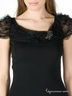 Трикотажный приталенный джемпер. Широкий круглый ворот. Рукав-фонарик из многослойной сборенной сетки с паетками. Так же оформлена горловина спереди. На груди пришита металлическая брошь в виде цветка со стразами.
