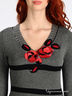 Трикотажный женский джемпер, с длинными рукавами и V-образным вырезом. Вырез оформлен в рубчик. Изделие украшено нашивками из плотного фактурного материала в виде цветов, ворот и манжеты украшены пайетками.
