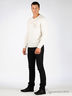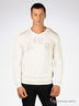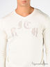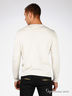 Превосходный джемпер белого цвета с V-образным вырезом горловины и длянными рукавами. Низ изделия, манжеты рукавов и вырез горловины окантованы в рубчик. Изделие декорировано ажурной вязкой в виде логотипа бренда.