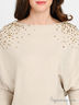 Стильный джемпер свободного силуэта с вырезом лодочка и длинным цельнокроеным рукавом. Высокие манжеты и низ изделия в виде трикотажной резинки в рубчик. Выполнен из мягкого эластичного трикотажа средней плотности. Полочка декорирована россыпью страз. Отличный вариант для создания повседневного образа.