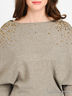 Стильный джемпер свободного силуэта с вырезом лодочка и длинным цельнокроеным рукавом. Высокие манжеты и низ изделия в виде трикотажной резинки в рубчик. Полочка декорирована россыпью страз. Отличный вариант для создания повседневного образа.