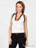 Модная майка прямого силуэта с оригинальный вырезом горловины на лямках. Изделие выполнено из эластичного трикотажа средней плотности и украшено контрастными вставками. Отличный вариант для создания повседневного образа.