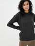 Вязаный джемпер с узором выполнен из теплой пушистой пряжи с добавлением эластана. Крой свободный. Круглый вырез горловины. Спущенные плечи. Длинные рукава. Края связаны широкой резинкой.