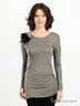 Удлиненный джемпер из изумительно мягкого и приятного на ощупь трикотажа. Широкая круглая горловина. Изюминку модели придает нашивка ( на кнопках) из перьев и бисера. Присборенно на резинку по боковому шву.