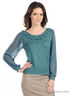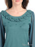 Детали: круглый вырез; длинный рукав с манжетой в рубчик; полочка декорирована трикотажной нашивкой с бусинами; низ изделия дополнен трикотажной резинкой