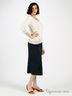 Элегантный трикотажный джемпер с узором "косичка". Длинный рукав. Широкий округлый вырез горловины, манжеты и низ изделия выполнены в виде резинки в темно-синюю полоску.