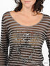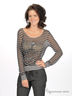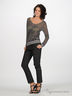 Полупрозрачный трикотажный джемпер с люрексом. Свободный силуэт. Длинные рукава. Манжеты и низ изделия посажены на трикотажную резинку. Полочка украшена пайетками и бисер.