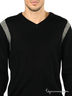 Детали: V-образный вырез горловины, длинный однокроеный рукав с небольшой трикотажной манжетой-резинкой, по низу изделия трикотажная резинка, по бокам изделия вставка из основной ткани серого цвета.