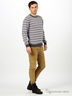 Детали: круглый вырез горловины, длинный однокроеный рукав заужен к запястью, по низу изделия и рукава трикотажная резинка, изделие выполнено расцветки в горизонтальную полоску.