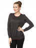 Джемпер однотонный с длинным рукавом. Низ изделия и рукава оформлен трикотажной резинкой. Вырез горловины круглый украшен отделочным кантом контрастного цвета.