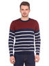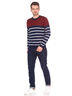 Джемпер мужской в полоску выполнен вязкой средней плотности. Рукав длинный. Вырез горловины округлый. Низ изделия и рукавов оформлены трикотажной резинкой.