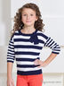 Джемпер для девочки с удлиненным плечом и горловиной-лодочкой, декорированной бантом. Модель свободного покроя с рукавами 3/4. Дополнено изделие принтом в полоску.