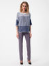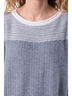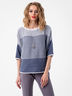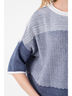 Эффектный джемпер свободного силуэта бело-синего цвета. Джемпер выполнен в технике ручного вязания из натуральных нитей. Круглый вырез изделия обработан двусторонней лицевой бейкой. Джемпер со спущенной проймой и втачными рукавами.