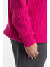 Очаровательный джемпер свободного силуэта розового цвета. Джемпер выполнен в технике ручного вязания из нитей с добавлением мохера. Изделие вывязано «английской» резинкой. Круглый вырез изделия, манжеты рукавов и низа изделия вывязаны резинкой 1*1. По переду изделия вывязан рисунок «коса».