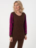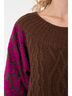 Эффектный джемпер полуприлегающего силуэта розово-коричневого цвета. Джемпер выполнен в технике ручного вязания из натуральных нитей с добавлением шерсти. Круглый вырез изделия обработан бейкой - «чулочная гладь». Джемпер со спущенной проймой и втачными рукавами. Втачные рукава выполнены из трикотажного полотна. По переду изделия вывязан рисунок "косы". По низу изделия и втачных рукавов - манжеты.
