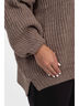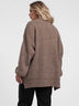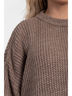 Стильный объемный свитер свободного силуэта коричневого цвета. Свитер выполнен в технике ручного вязания из нитей с содержанием шерсти. Круглый вырез изделия обработан «чулочной» гладью. Свитер со спущенной проймой и втачными рукавами. По низу изделия и рукавов — манжеты.