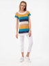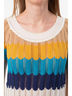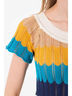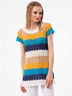 Летний джемпер прямого силуэта сине-оранжевого цвета с рукавами реглан. Джемпер выполнен в технике «ручного вязания» из натуральных нитей с содержанием хлопка. Круглый вырез обработан «чулочной» гладью.