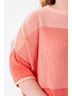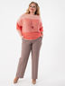 Эффектный джемпер свободного силуэта кораллово-персикового цвета. Джемпер выполнен в технике ручного вязания из натуральных нитей. Круглый вырез изделия обработан двусторонней лицевой бейкой. Джемпер со спущенной проймой и втачными рукавами.