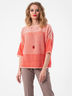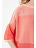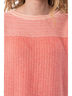Эффектный джемпер свободного силуэта кораллово-персикового цвета. Джемпер выполнен в технике ручного вязания из натуральных нитей. Круглый вырез изделия обработан двусторонней лицевой бейкой. Джемпер со спущенной проймой и втачными рукавами.