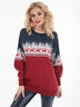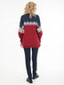 Обаятельный свитер свободного силуэта сине-красного цвета. Свитер выполнен в технике «ручного вязания» из нитей с содержанием шерсти. Круглый вырез изделия обработан двусторонней лицевой бейкой. Низ втачных рукавов со спущенной линией проймы и низ изделия обработаны манжетами вывязанными в технике «резинка».