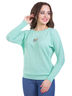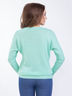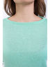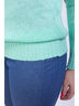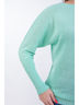 Стильный джемпер свободного силуэта мятного цвета с цельнокроеными рукавами. Джемпер выполнен в технике ручного вязания из нитей с содержанием хлопка. Круглый вырез изделия обработан двусторонней лицевой бейкой. По низу изделия и рукавов — манжеты.