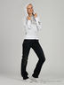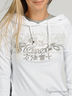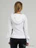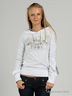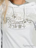 Оригинальный джемпер-двойка. Нижний джемпер цвета серый меланж. Круглая горловина. Длинные рукава. Верхний джемпер белого цвета с принтом и крупными стразами. Капюшон на кулиске, декорирован многорядной резинкой. Длинные рукава реглан с манжетами и разрезами по боковому шву. Спереди разрезы - имитация карманов.