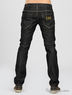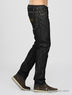 Модные джинсы прямого пятикарманного покроя. На поясе шлевки для ремня. Застежка на пуговицы. Задний накладной карман декорирован нашивкой с металлической пластиной. Спереди изделия декоративные складки, джинсы украшены контрастной прострочкой.